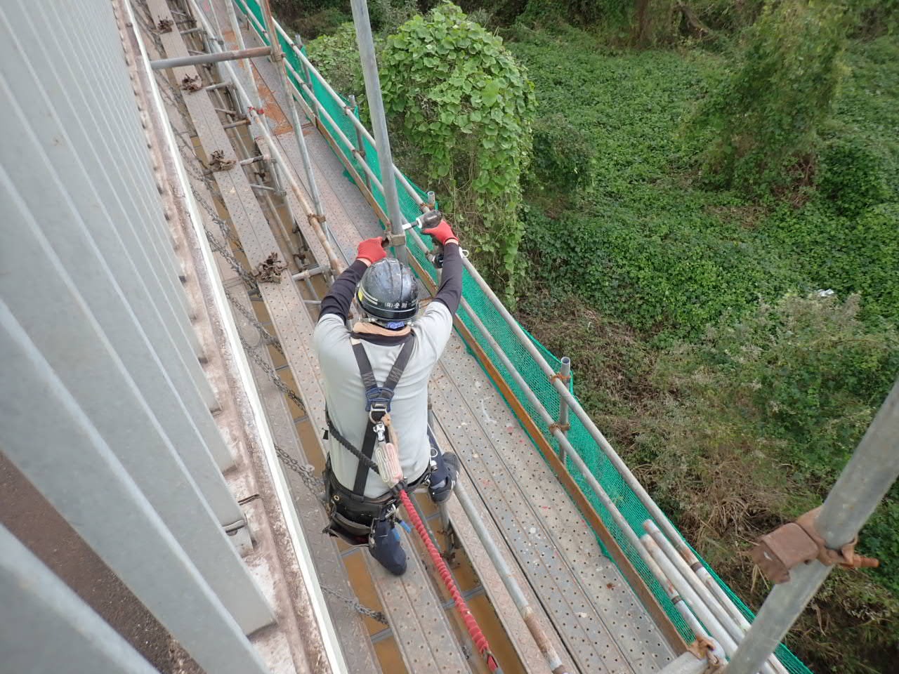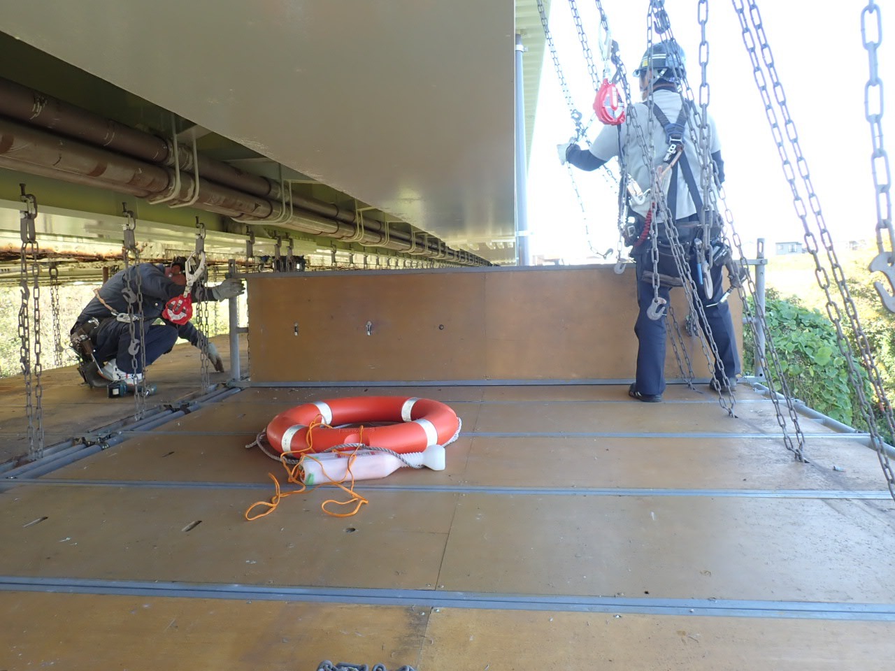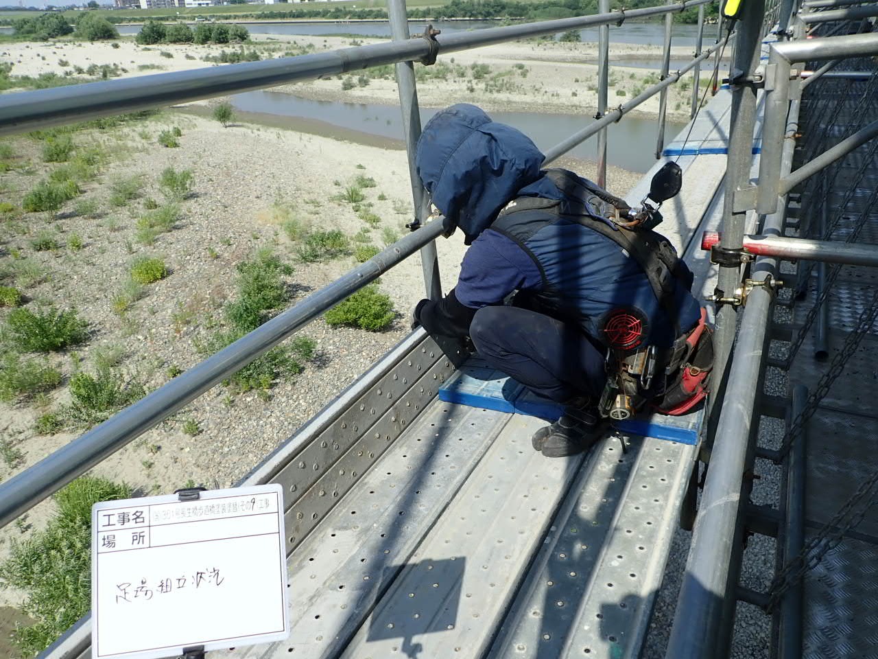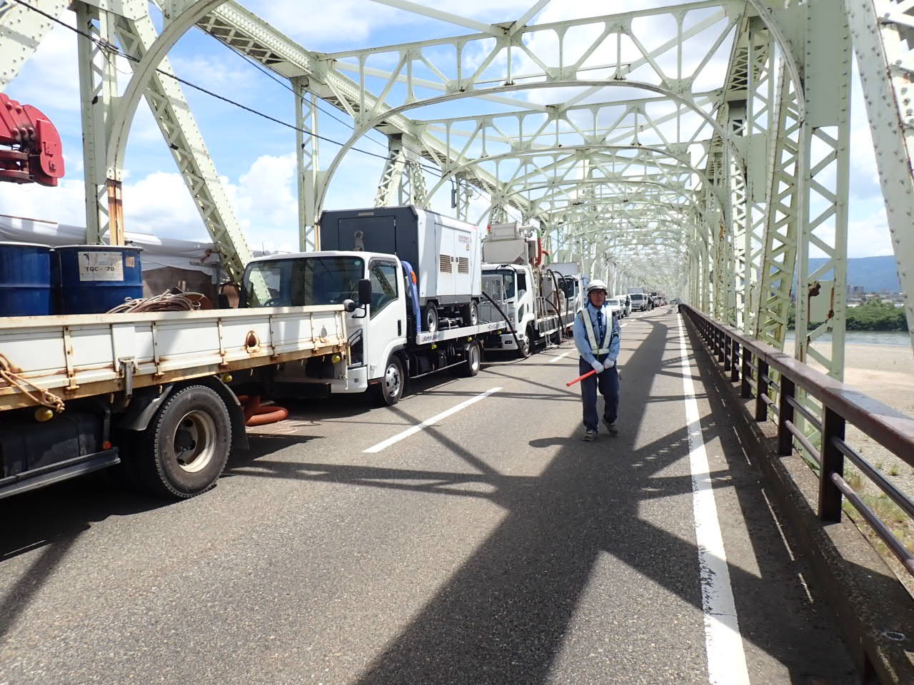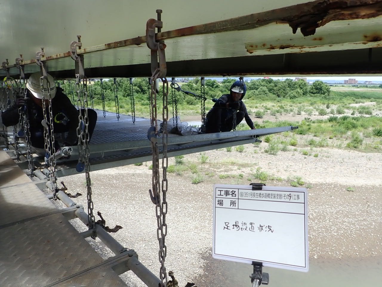 8月末現在、順調に塗装素地調整作業(ブラスト)を進めています。 防護服を着用しての非常に暑い中での作業となりますので、熱中症には十分に注意して作業しております。 交通規制については、車道通行止めを引き続き行います。 ご迷惑をお掛けしますが、何卒ご協力の程よろしくお願いいたします。