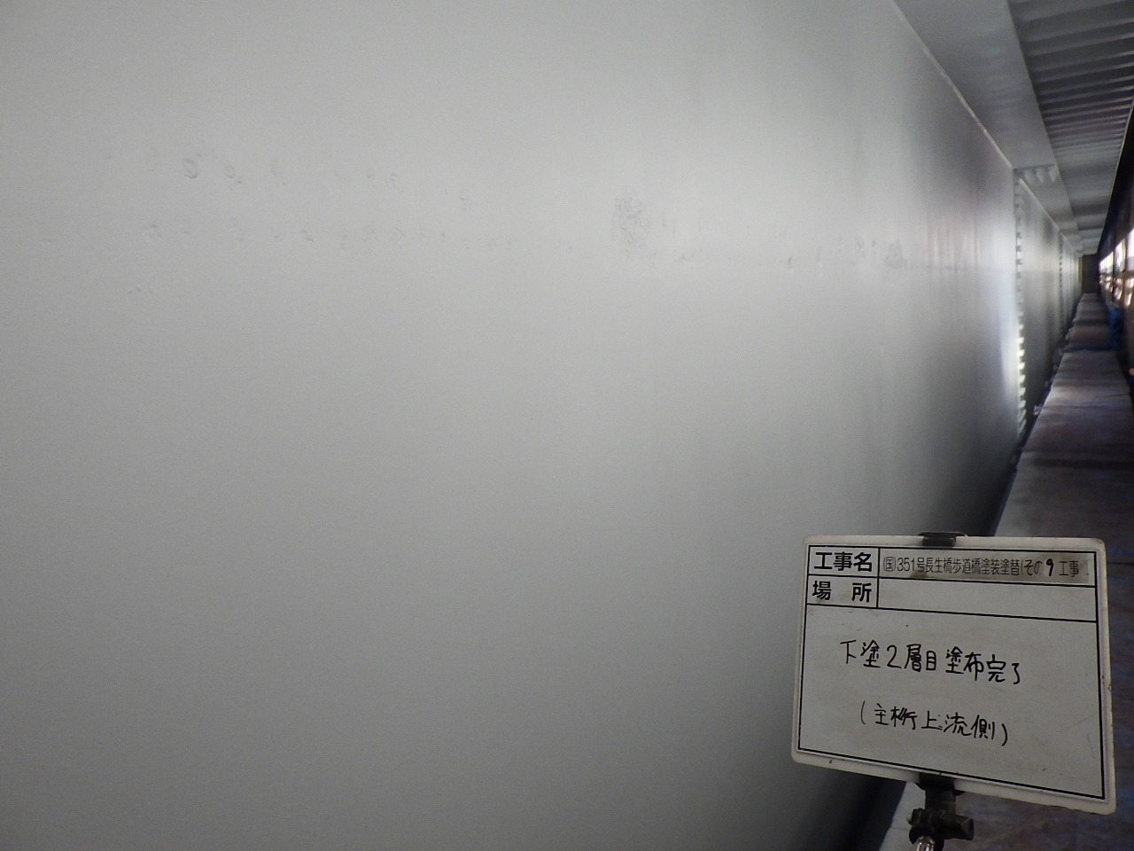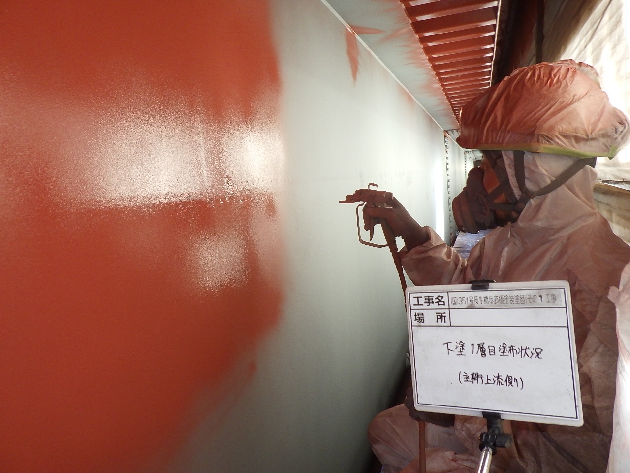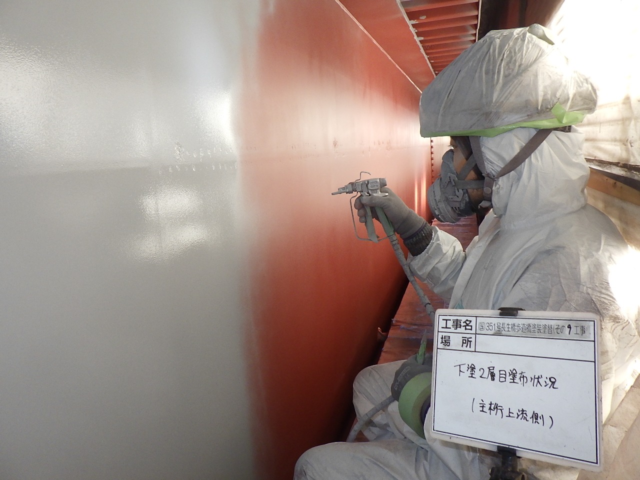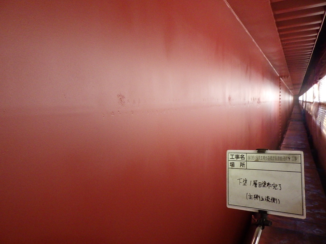9月半ばにブラスト完了し、塗装作業を進めています。 9月末現在、全5層塗装のうち1層目の防食下地塗が完了し、2層目の下塗1層目作業を行っています。 交通規制については、9月26日に一旦車道通行止めを完了いたしました。 11月に再開予定ですので、ご迷惑をお掛けしますが、今後とも何卒ご協力の程よろしくお願いいたします。