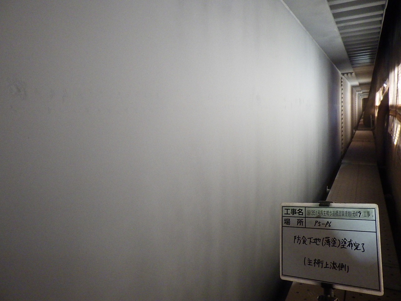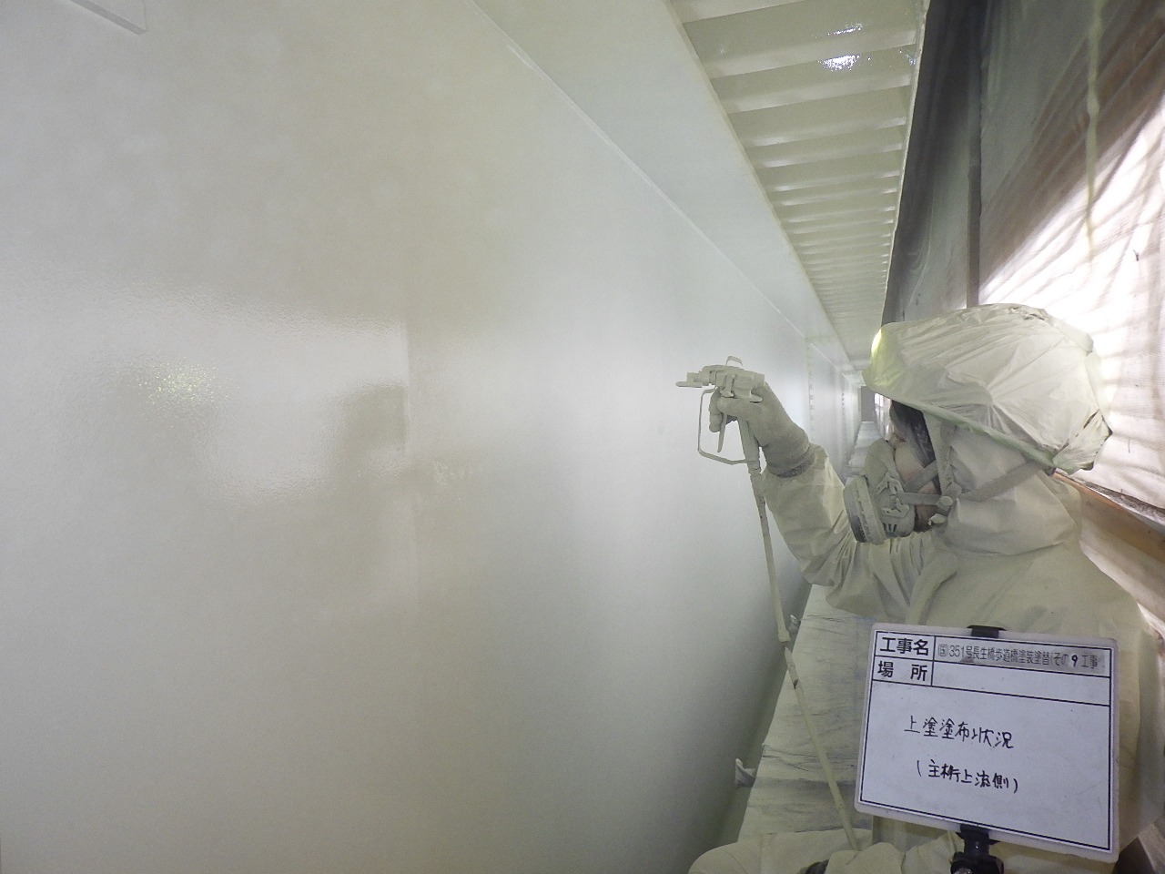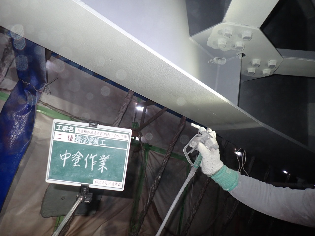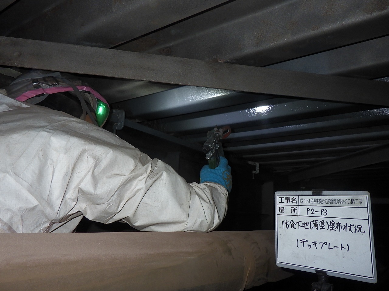 9月半ばにブラスト完了し、塗装作業を進めています。 9月末現在、全5層塗装のうち1層目の防食下地塗が完了し、2層目の下塗1層目作業を行っています。 交通規制については、9月26日に一旦車道通行止めを完了いたしました。 11月に再開予定ですので、ご迷惑をお掛けしますが、今後とも何卒ご協力の程よろしくお願いいたします。