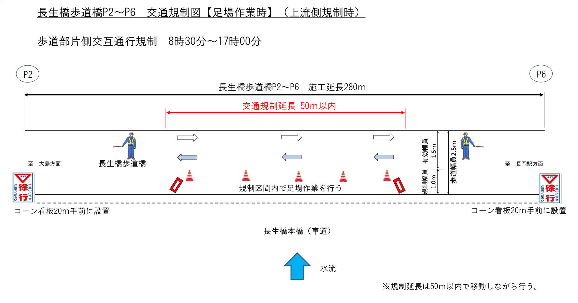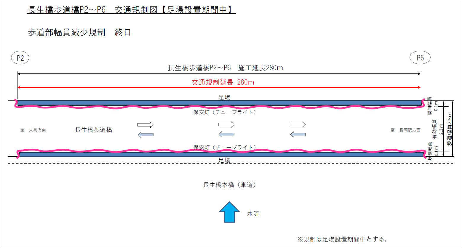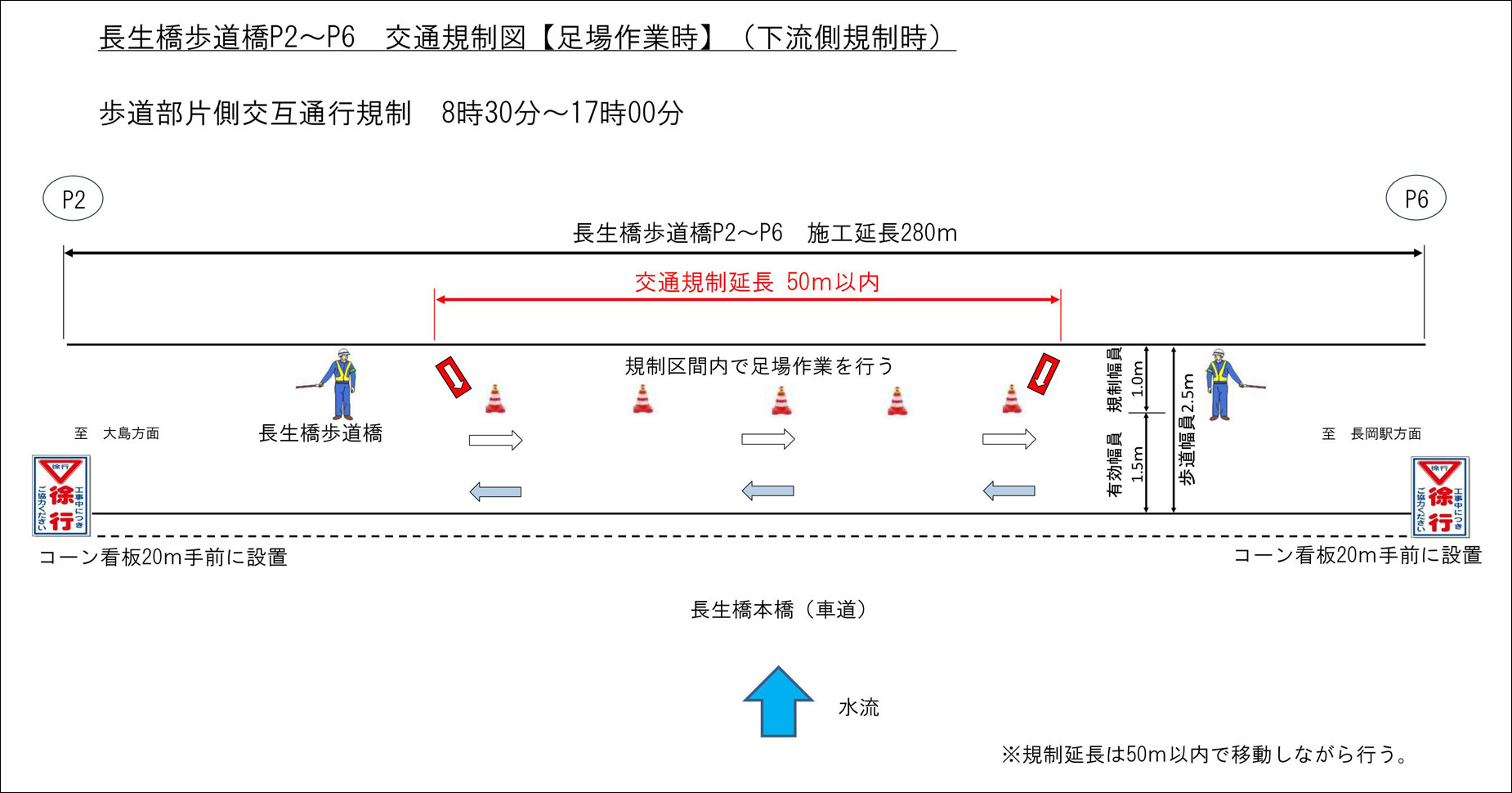 長生橋歩道橋の塗装塗替工事に伴い、下記内容にて長生橋歩道部の交通規制(幅員減少)を行います。
