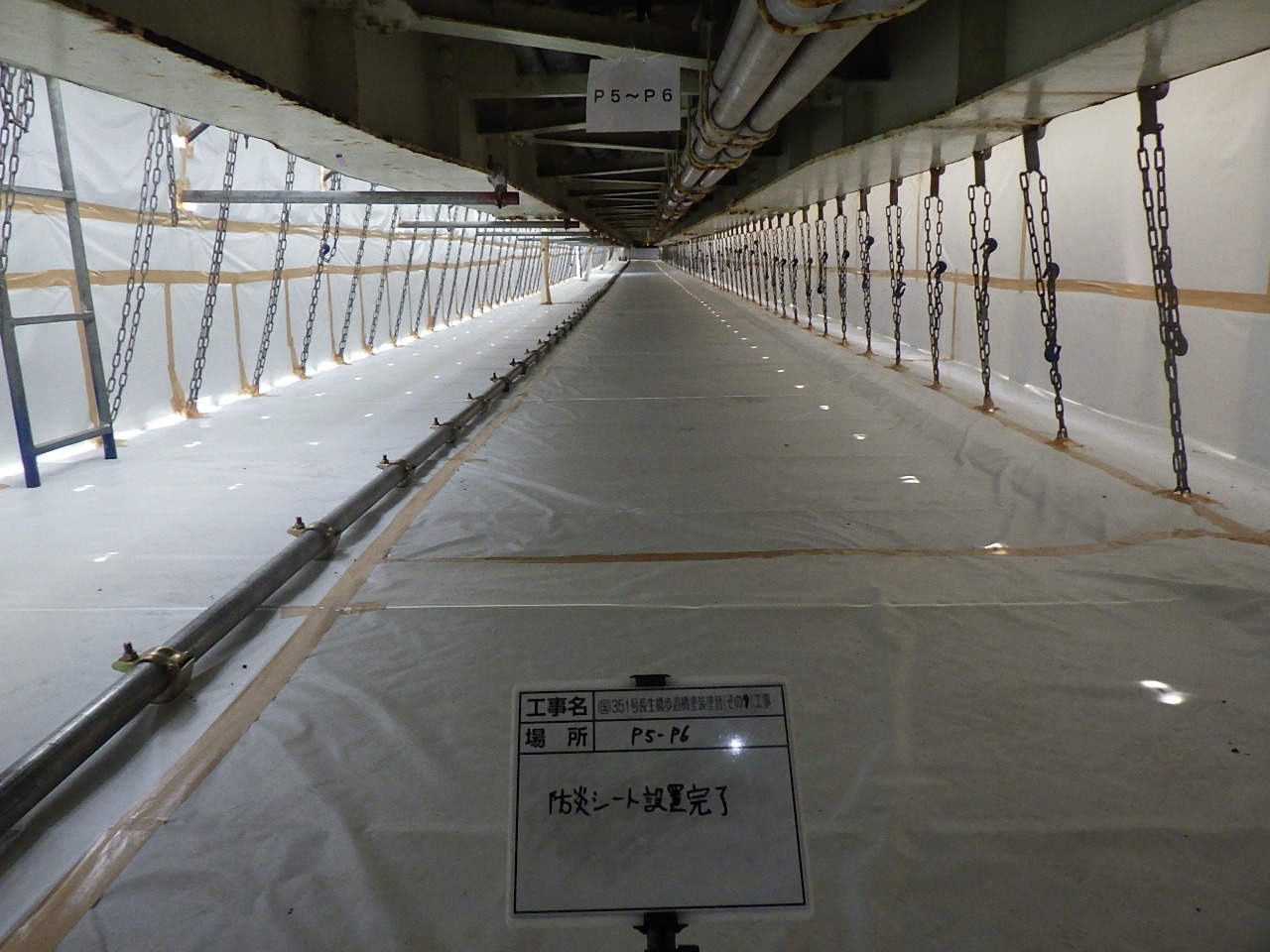 9月半ばにブラスト完了し、塗装作業を進めています。 9月末現在、全5層塗装のうち1層目の防食下地塗が完了し、2層目の下塗1層目作業を行っています。 交通規制については、9月26日に一旦車道通行止めを完了いたしました。 11月に再開予定ですので、ご迷惑をお掛けしますが、今後とも何卒ご協力の程よろしくお願いいたします。