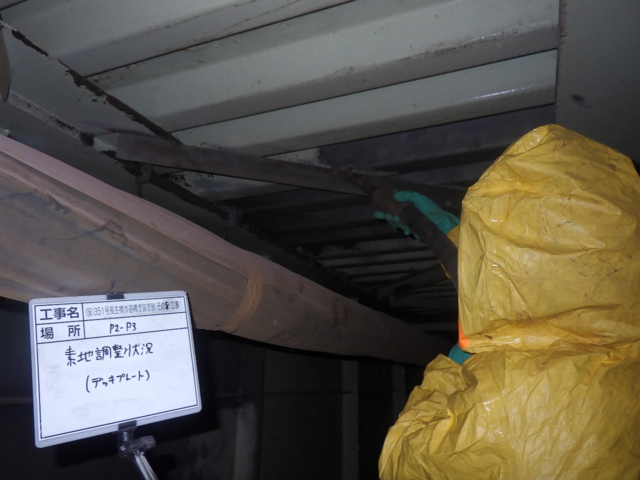 8月末現在、順調に塗装素地調整作業(ブラスト)を進めています。 防護服を着用しての非常に暑い中での作業となりますので、熱中症には十分に注意して作業しております。 交通規制については、車道通行止めを引き続き行います。 ご迷惑をお掛けしますが、何卒ご協力の程よろしくお願いいたします。